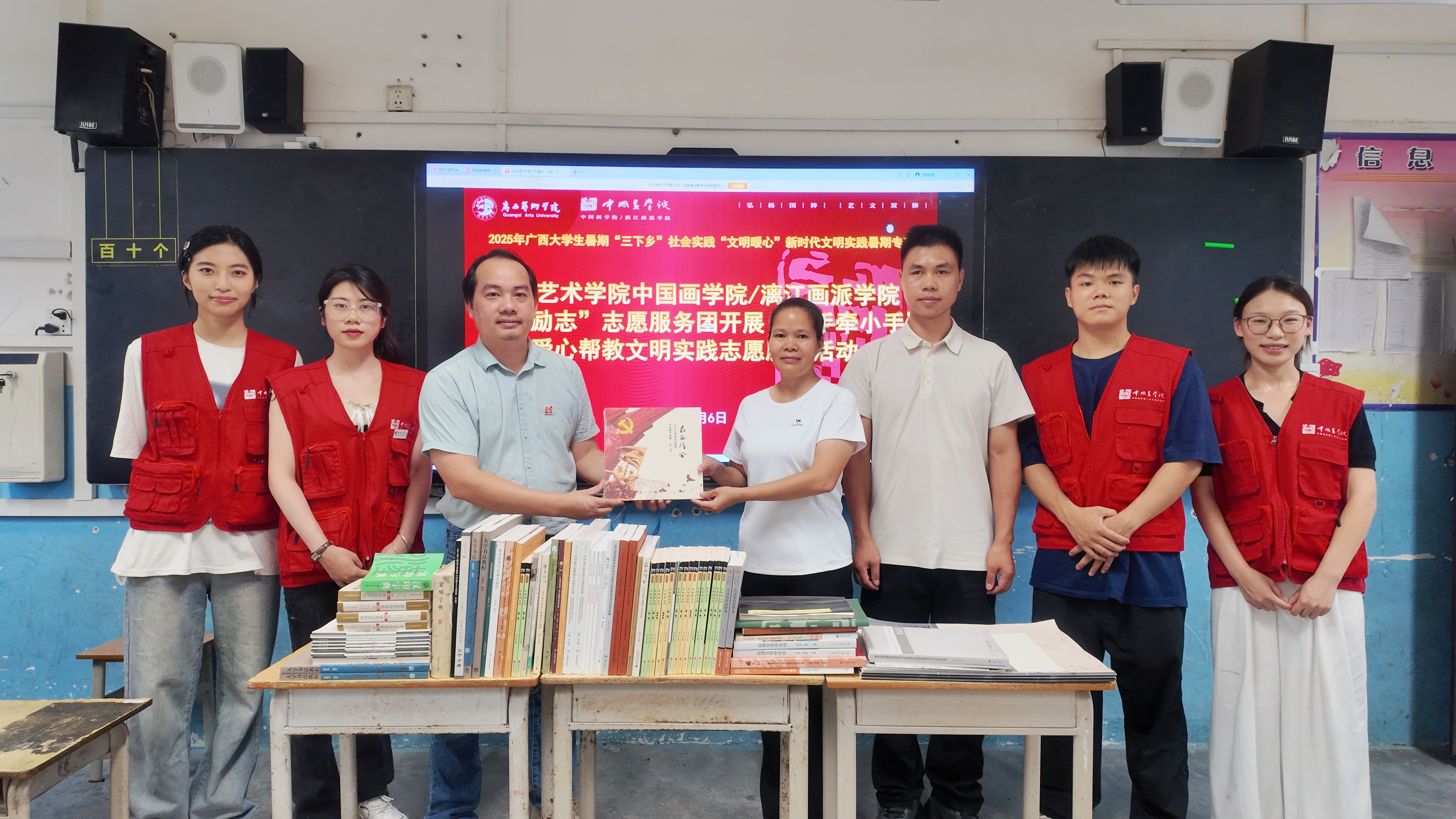 为持续支持服务当地美育建设,厚植爱国情怀与文化自信,志愿服务队代表学院向当地学校捐赠相关书画著作等读物100余册,用于打造“美育共享阅读角”,旨在营造“以美育人、以文化人”的校园氛围,让孩子们在书香墨韵的日常浸润中汲取中华优秀传统文化养分,涵养爱国精神与高尚品格,受益终身。
