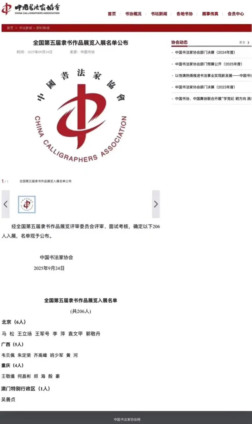 中国书法家协会网站“全国第五届隶书作品展览入展名单公布”截图
