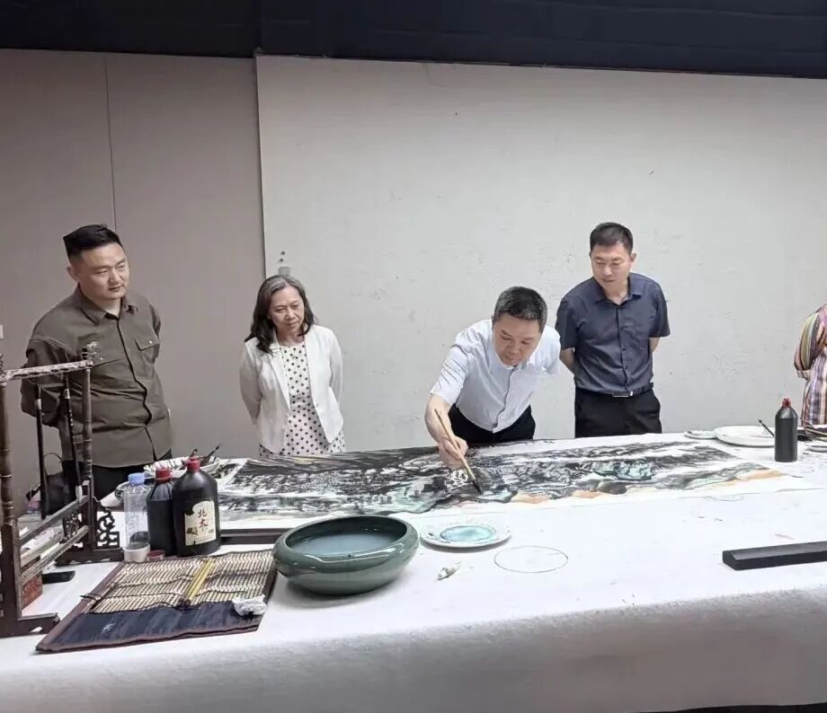 笔会现场墨香扑鼻,气氛融洽热烈。双方代表齐聚一堂,以笔会友,切磋技艺。创作者们笔走龙蛇,各擅胜场——漓江之灵秀、壮乡之醇厚、花鸟之雅致,皆跃然纸上。作品融传统韵味与时代精神于一体,不仅展现高超的专业素养,更体现当下美术创作的创新活力。